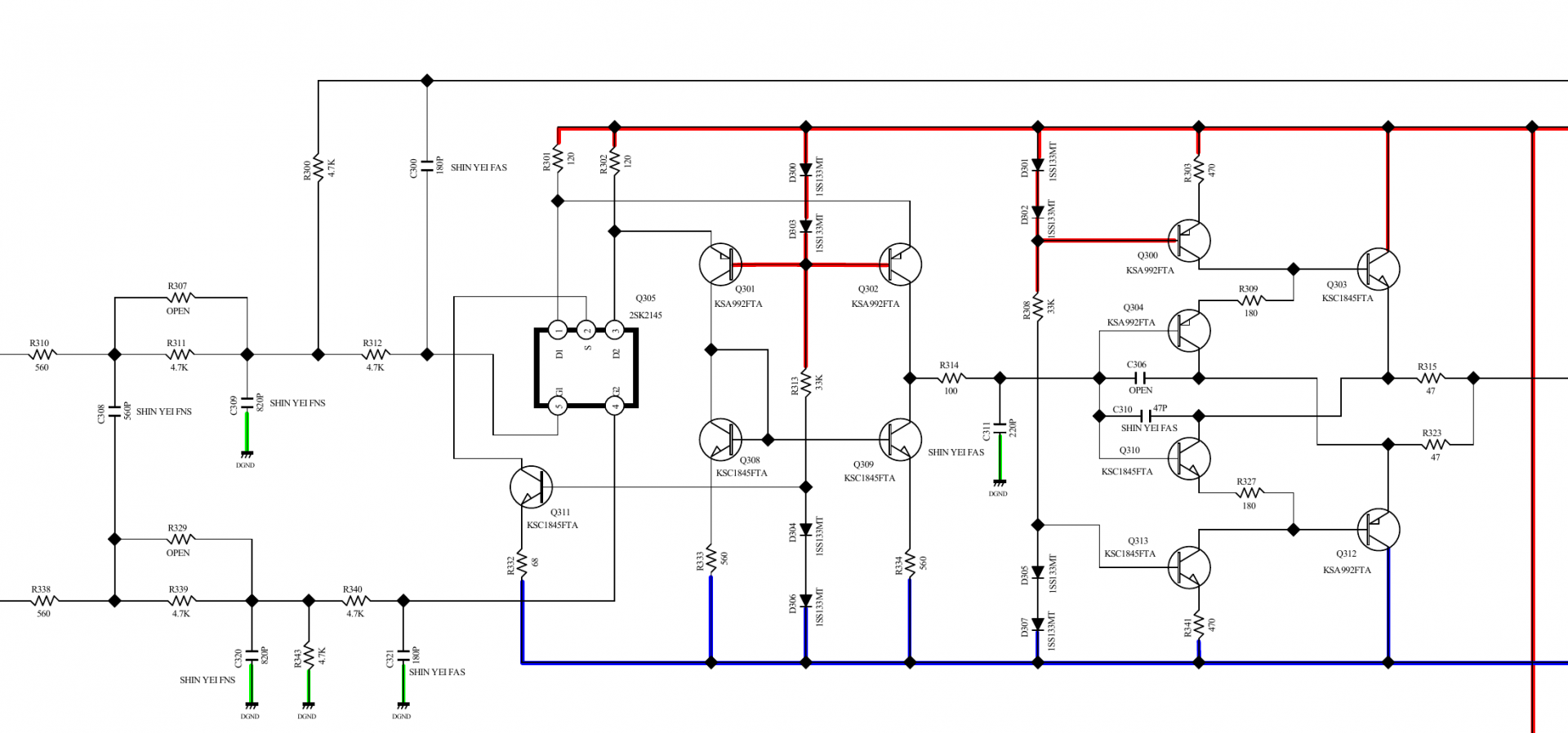 Çalışmayan devrede Q305 eşleştirilmiş JFET gate'lerinden birisi ortalama -5 V civarında diğeri +1V civarında. yüzüyor. Çalışan devrede her iki gate de +1V civarında. Herhalde sorun bunda.