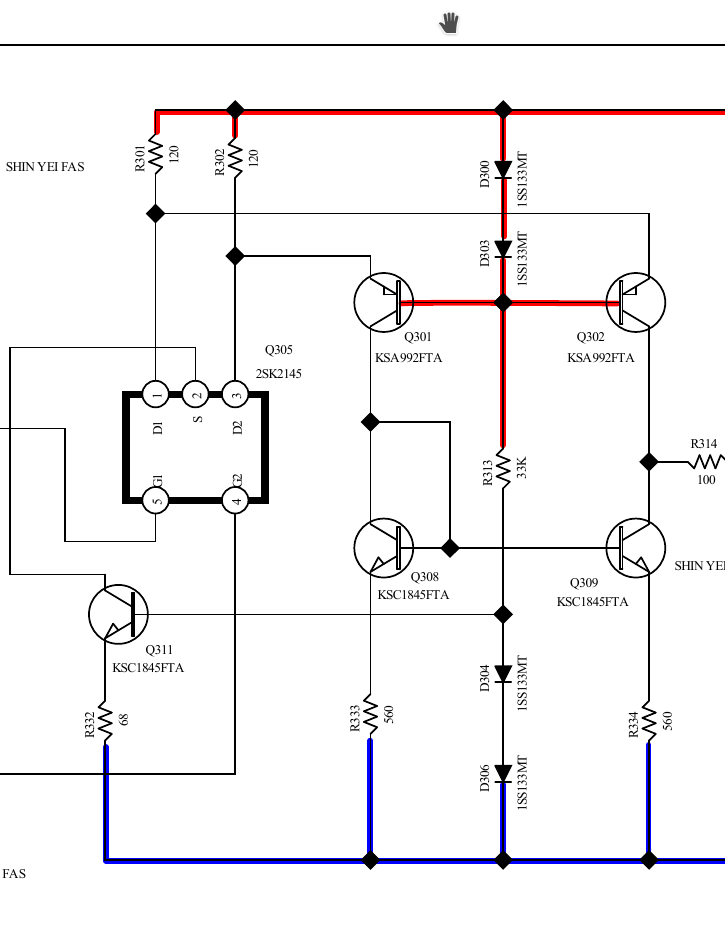 Devreden optik sinyali ayırdım ve multimetre ile DC çalışma noktasını kıyasladım iki kanalın. Tek tek transistörlerin üzerinde ölçümler yaptım. Devrenin şurasına odaklandım: Çalışan devrede 2SK2145 in 1 numarasında 11.55 V gibi bir voltaj var. Çalışmayan devrede o noktada 12.08 V var. Doğrudan besleme voltajına bakıyorum, o da 12.08V gibi. Hmm, o zaman Q302 hiç iletime geçmiyor diye düşündüm. Sonra Q302 nin baz emitterine baktım, 1.2 V var. Q302 nin kollektör emitterine baktım, 12 V dan fazla bir voltaj var. Hah dedim, tamam. Bu transistör iletime geçmesi gerekiyorken geçmiyor.