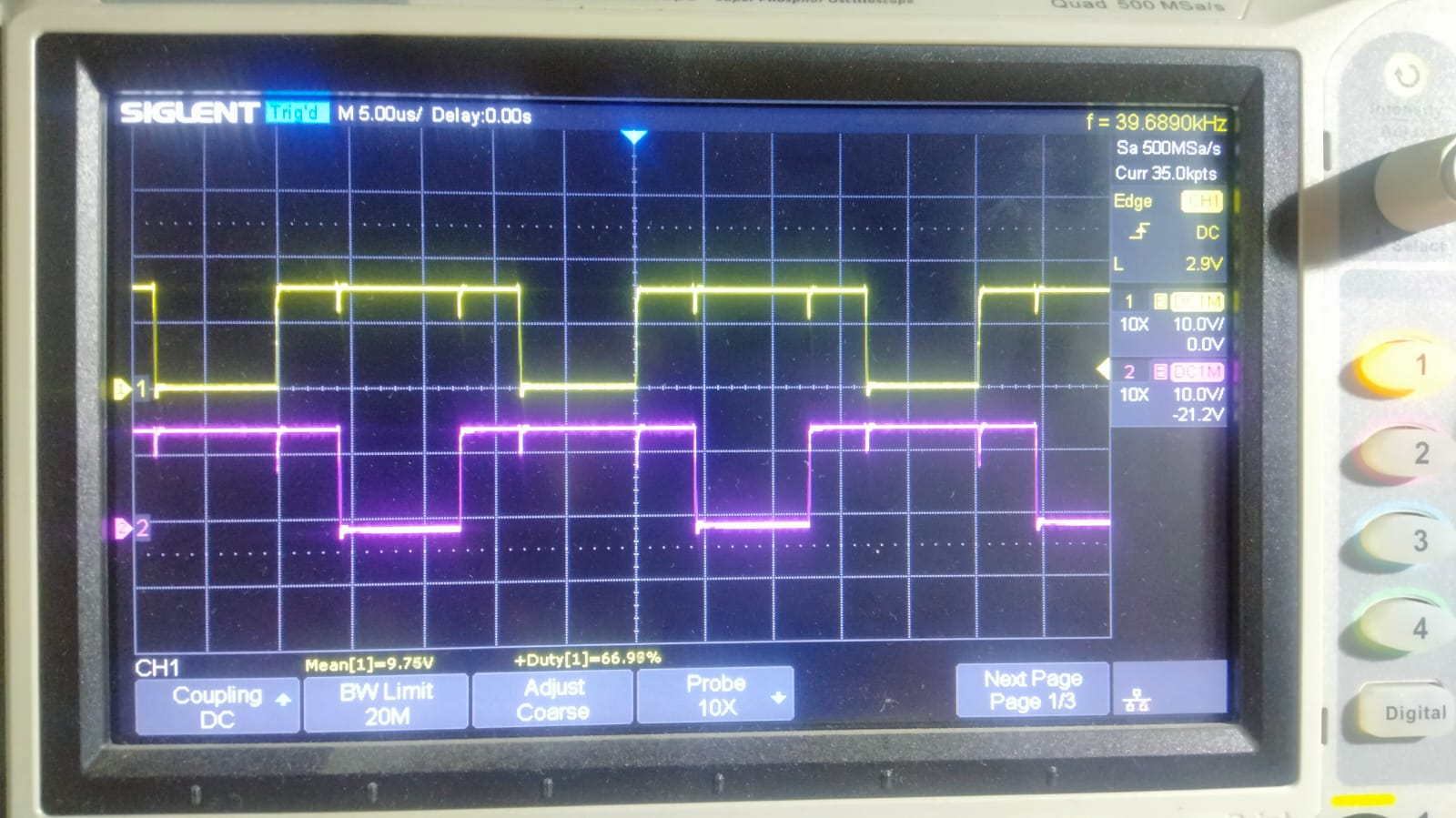 Verdiğin resimdeki sinyaller gate trafosunu süren 15V full bridge sinyali , AC sinyaldir DC değil , sen gnd ye göre osilskopda baktığın için garip görünüyor ama iki ucunu bağlayıp tek kanal baksan hemen anlaşılır.