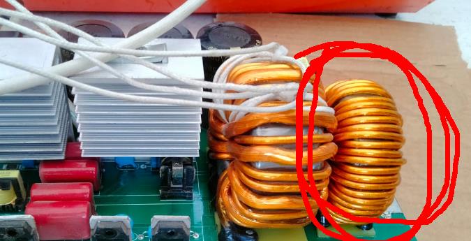 İşaretlediğin bobin 3 tel paralel olarak sarılmış indüktör. İnverter kartında entegre yok, kontrol kartında opamp bile yok.