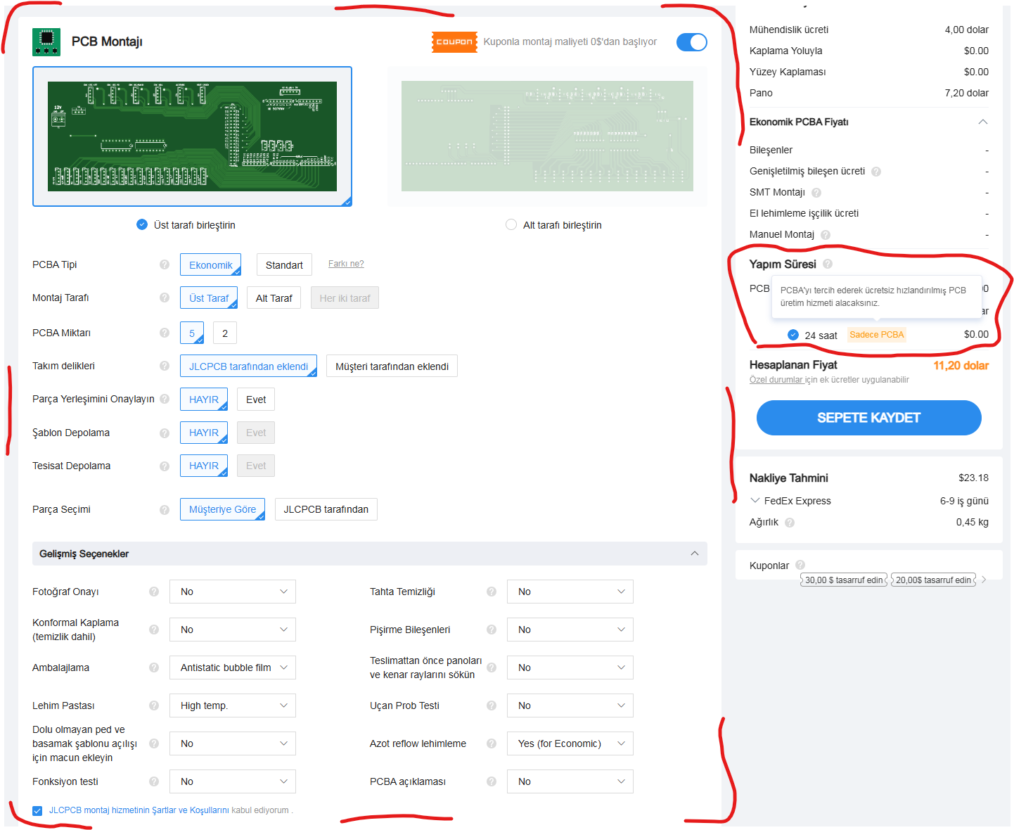 Normal yaptırsam 2 gün sürüyor. Ama PCBA seçersem hem 24 saatte yapıyorlar hem parça parası almıyorlar, hem de dizgi yapıyorlar.