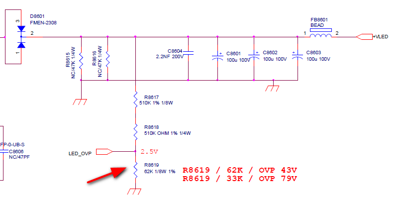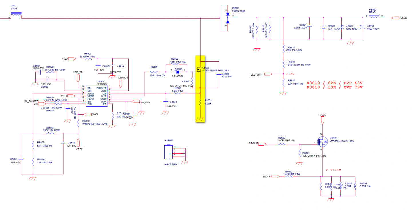 Pardon +VLED üzerindeki gerilimin değişmesi normal PF7909S (Single-Channel WLED Backlight Driver) entegresi ile sürülen bir mosfet var. Gücü 0.03R değerindeki R8601'de harcıyor. Aslında bu iyiye işaret çünkü entegre işini doğru şekilde yapıyor gibi. Bu durumda çıkıştaki kondansatörler çok daha ciddi şüpheli duruma düşüyor.