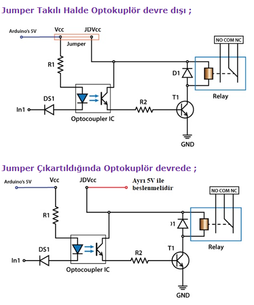 Önce arduinoyu USB girişten, USB şarj adaptörüyle beslemeyi deneyin, olmadı röle beslemesini ayırmayı denersiniz. En son kablolarla uğraşırsınız.