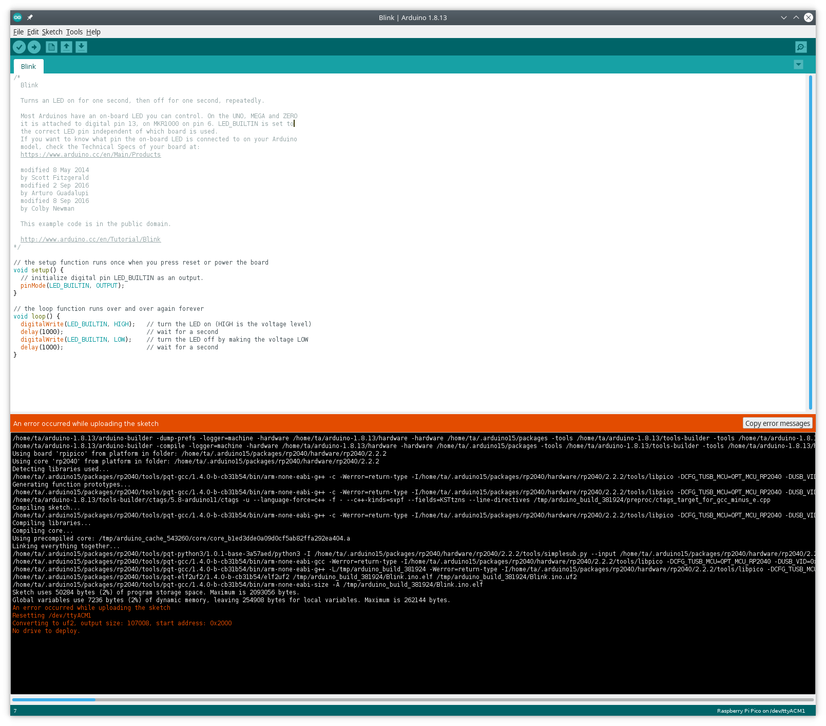 İlk defa yükleme yapmak için düğmeye basılı tutup usb ye bağlamak gerekiyor. Sonra bir daha kafası karışana kadar istemiyor butonuArduino blink programını derledim. Yüklemeye çalışınca hata verdi. Zaten şimdiye kadar fazla iyi gitmişti, bir pislik çıkma vakti gelmişti.