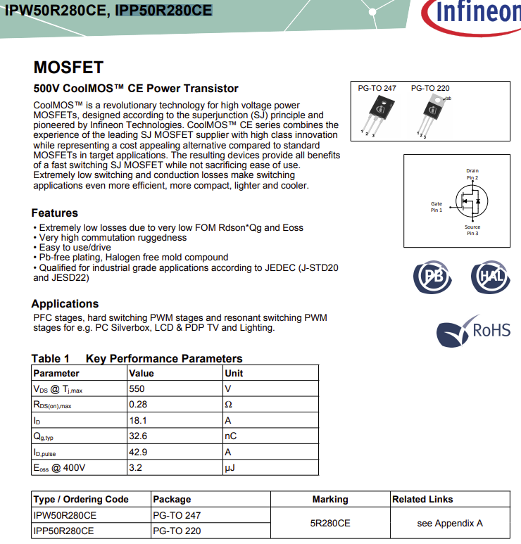 Abi diğer elemanlara da göz atıyorum da IPP50R280CE numaralı iki tane mosfet diyot var.