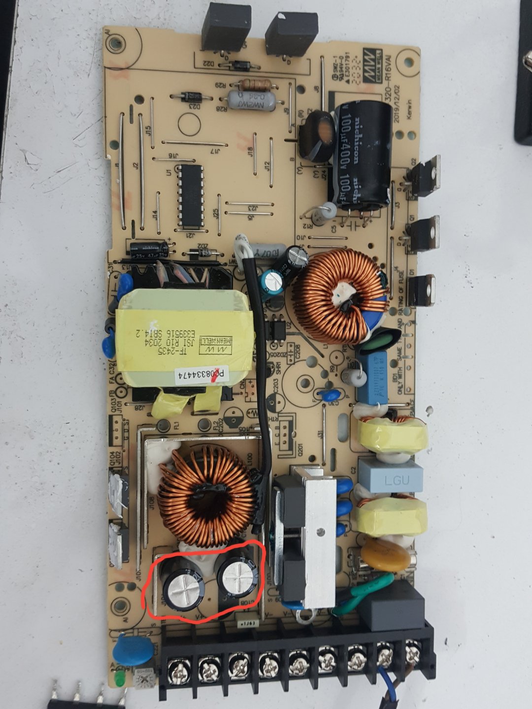 Sıcak hava tabancası ile lehimler eriyene kadar ısıtıp alttan çektim. Ancak öyle çıktı.Veya iki havya varsa ikisi ile aynı anda ısıt. Başka birisi de kondansatörü çıkarsın.