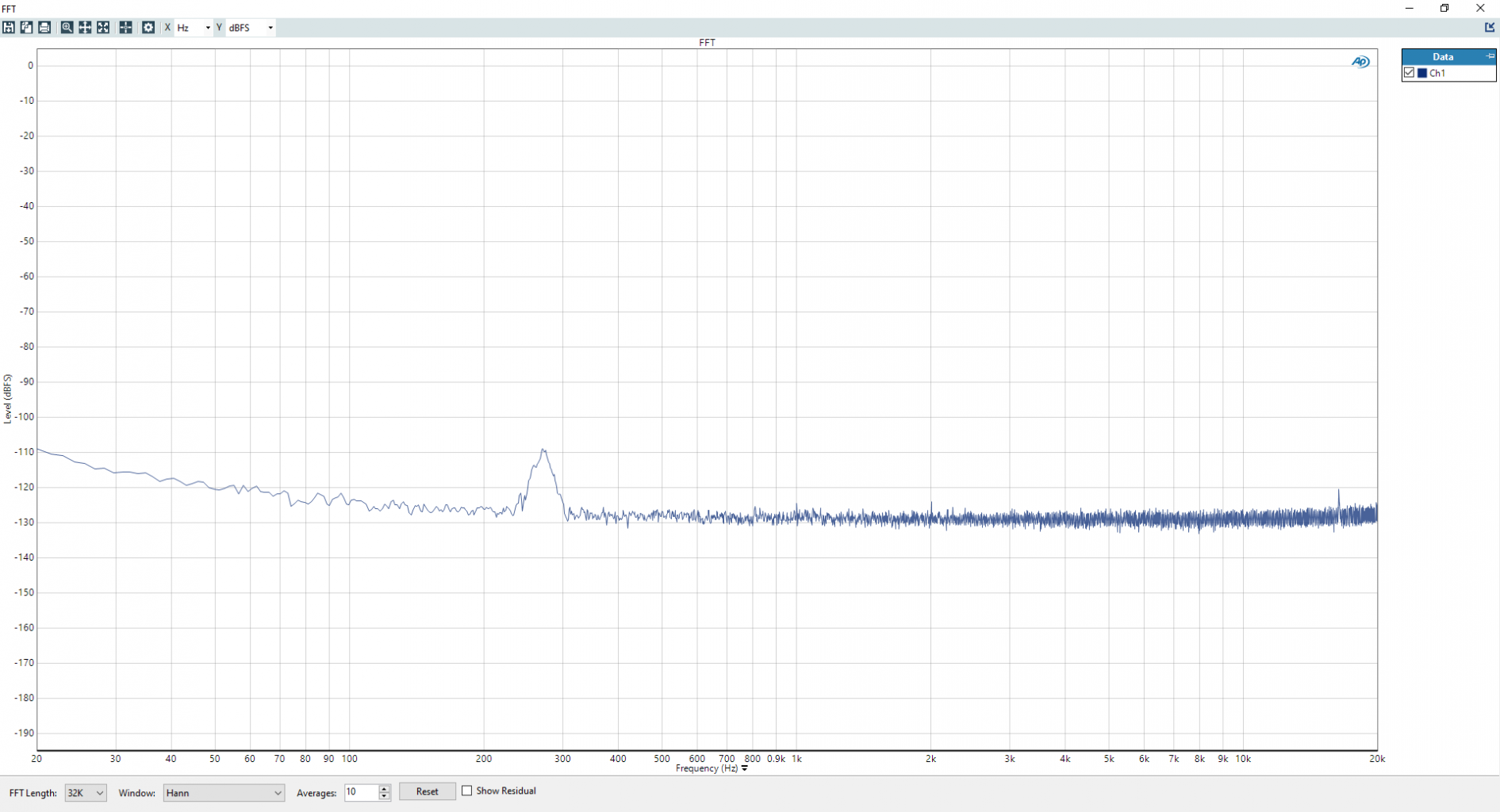 UCA202 nin L girişini kısa devre edince AP525 ile ölçtüğüm spektrum (ama burada gösterilen değer 1.733 dB eksik gösteriliyor ama ihmal edilebilir)