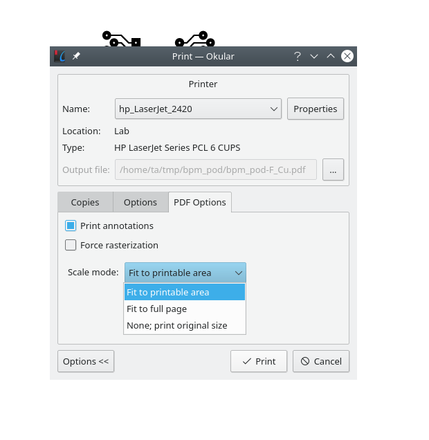 Sen yine iyi program kullanıyorsun. Ben chrome dan gönderdim yazıcıya. Şimdiye kadar en çok 24 bacaklı entegre kulkandım, onlarda da hiç pad sorunu yaşamadım.Tamam buldum sorunu. Benim PDF uygulaması (Okular) yazdırırken ölçekleme seçeneği var. Ben "Fit to printable area" seçili iken basmışım. Şimdi "None; print original size" dedim ve şu anda ölçü tam oturuyor.