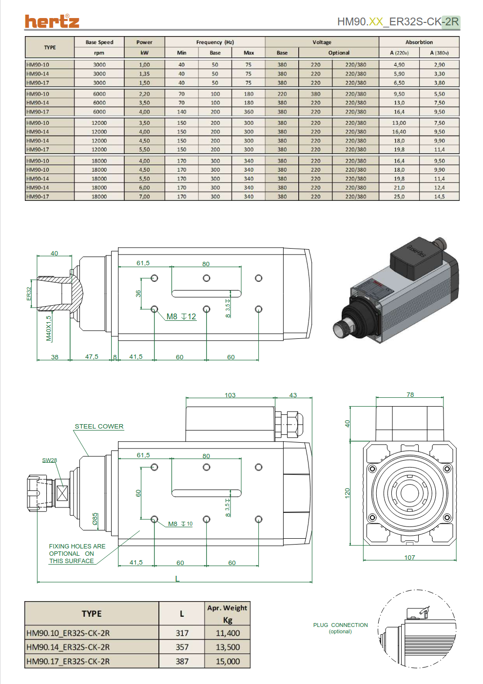 Aldığım motor aşağıdaki tablodaki ilk sıradaki motor (HM90-10). Baz çalışma voltajı 380 V. Bir de opsiyonel 220, 220/380 demiş, bunun ne anlama geldiğini bilmiyorum. Baz çalışma frekansı da 50 Hz. Baz devir sayısı da 3000 rpm. 40 Hz için 2400 rpm, 75 Hz için de 4500 rpm.