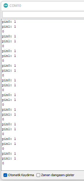 Bağlı olduğu pinleri okuyorum 1 çıkıyor. Sonra tuşlara basıyorum ama hiç 0'a düşmüyorlar.