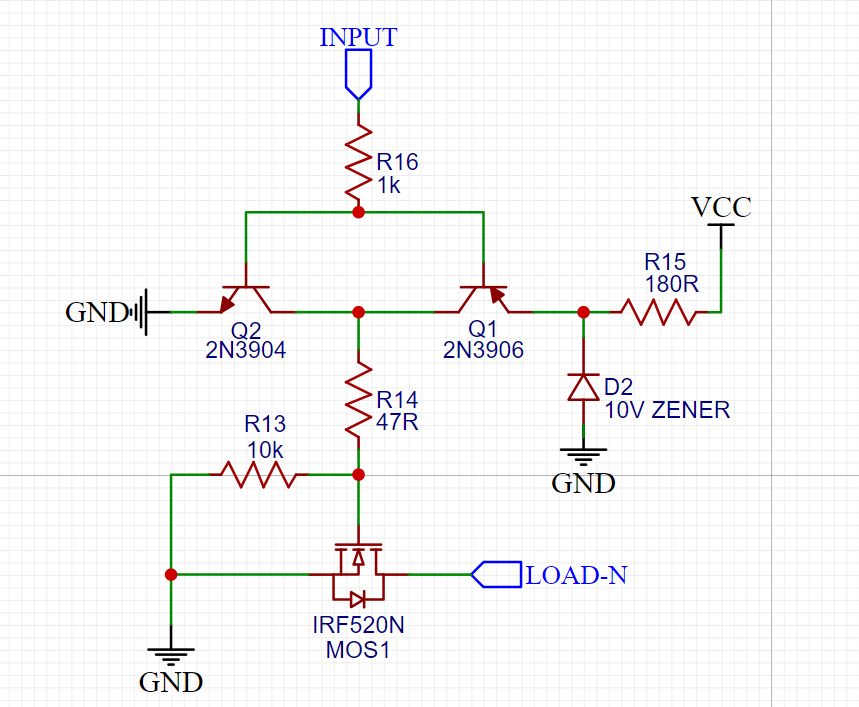 Zaten Mosfeti suren 2N3906 li devrede ciddi sorun var. O sekilde olmaz. Eger o sekilde sureceksen R13 ucunu NPN bir transistor uzerinden surmen gerekiyor.