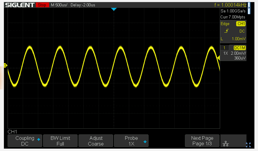 33612A dan 1 mVrms sinüs üretiyorum, osiloskopta yukarıdaki gibi neredeyse gürültüsüz ölçüyorum. Aynı şekilde SDG2042X den 1 mVrms sinüs üretiyorum, gene neredeyse gürültüsüz osiloskopta görüyorum.
