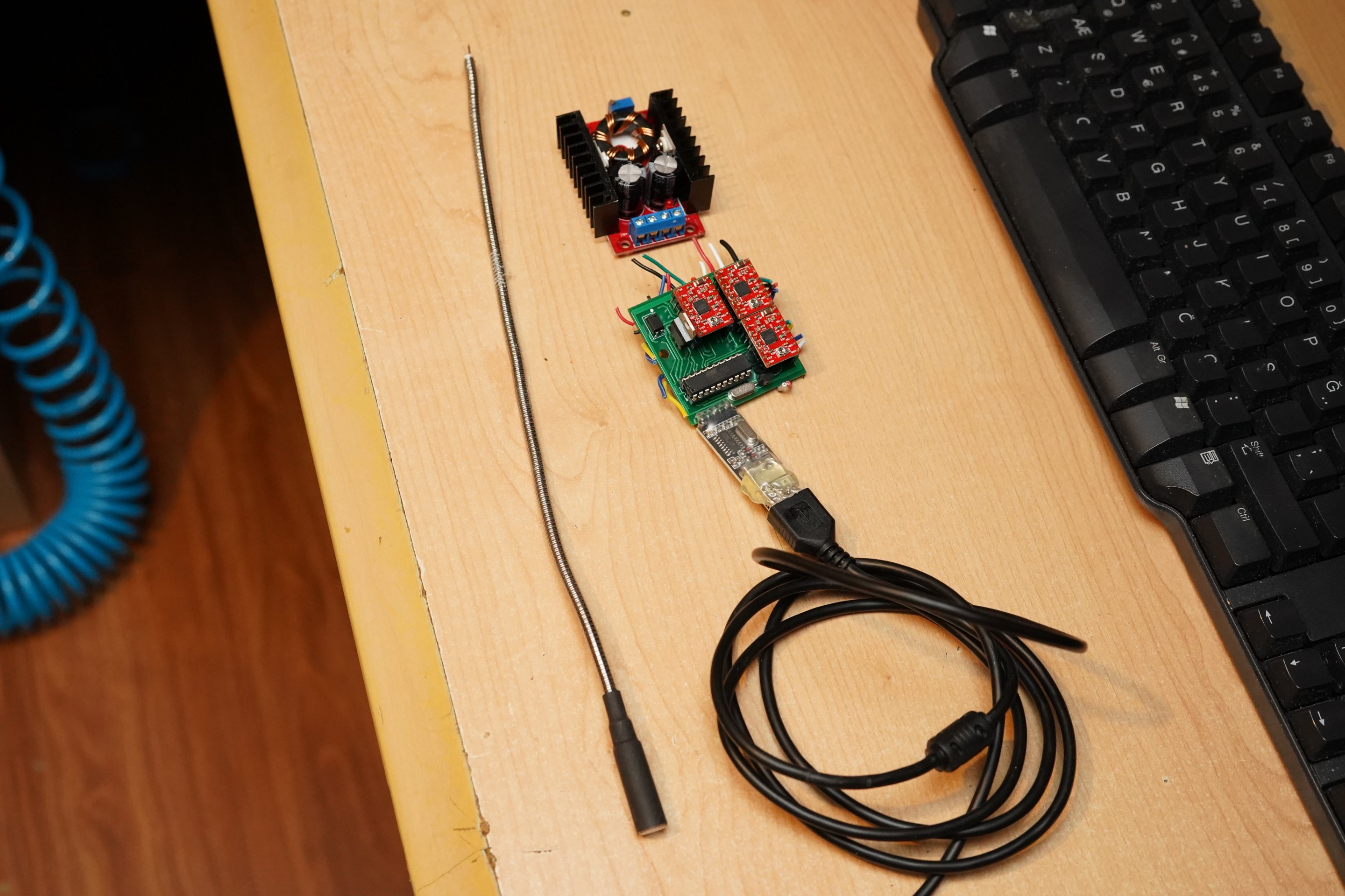 Makinanın içinden bunlar çıktı. Bir tane Atmel işlemcili ve USB arabirimli kontrol kartı, üç tane eksen sürücüsü, bir tane de boost converter.