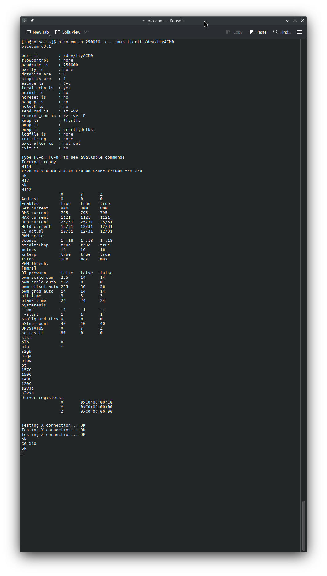 Y eksenine hemen bir JST konnektör takıp benim karta bağladım. Y ekseni şu anda picocom terminal emülatöründen kontrol edebiliryorum. Ve eksen hareketi neredeyse sıfır ses :tamam2: