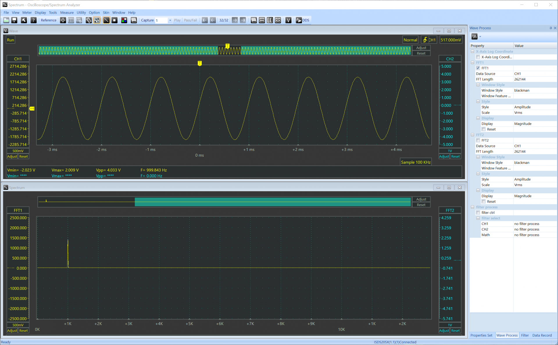 Ooo tamam spektrum da var. Spektrumu aktif hale getir ve 1 kHz dışındaki frekans bileşenlerini minimuma indirmeye çalış. Aşağıdaki kadar ideal bir sonuç elde edemeyebilirsin, önemli olan olabilecek en aza indirmek.
