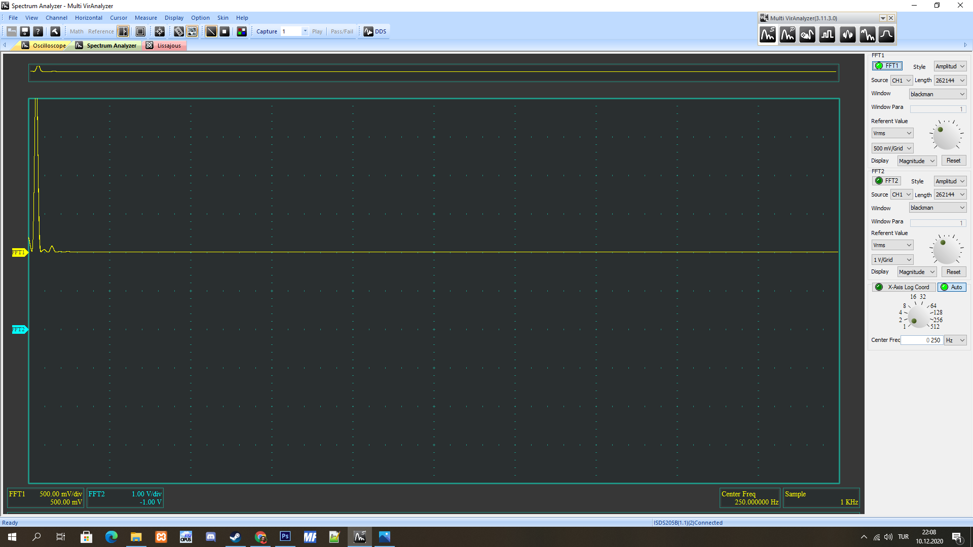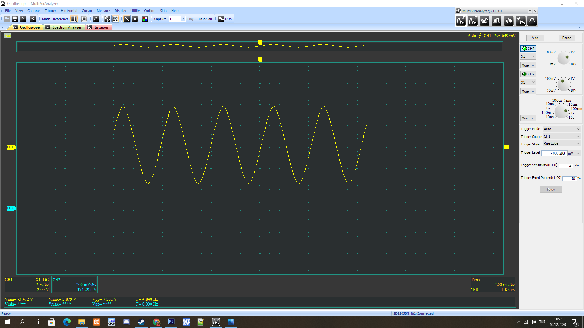 Şimdi benim sinyal jeneratör ile 1 kHz 2 Vpp sinüs üretip görüntüledim. Aynı ayarları deneyebilirsin.