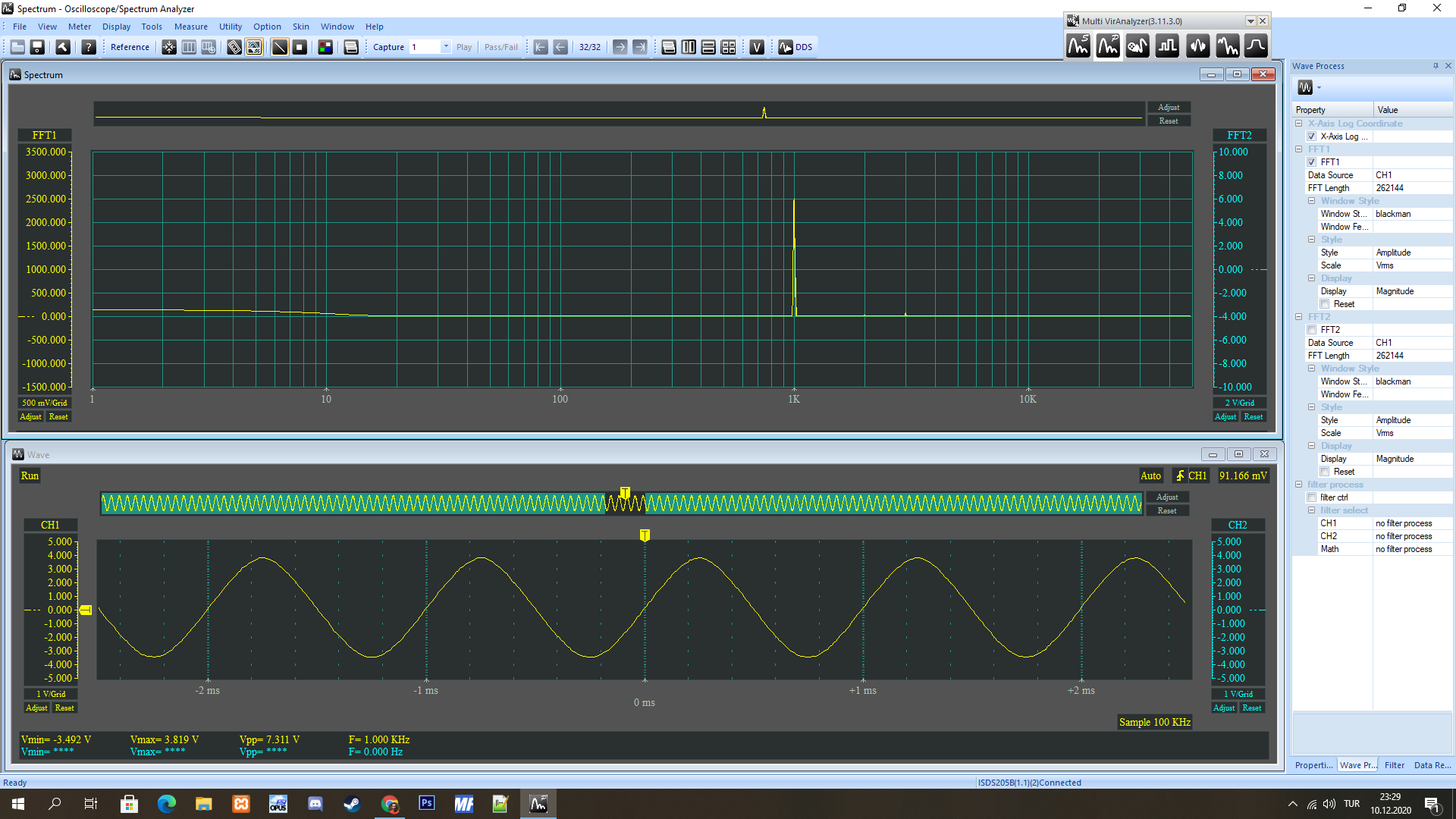 Evet spektrum DC offset olduğunu gösteriyor, ve voltaj ölçümlerine bakınca da 300 mV gibi bir asimetrinin olduğu görülüyor. Bunu "symmetry" ayarı ile giderebilmen lazım. Bir de çok az miktarda harmonik distorsiyon var (2 kHz ve 3 kHz de çok küçük pikler var) Bunları "distortion" ayarı ile artık ne kadar azaltabilirsen kardır, ama bir miktar mutlaka kalır, çünkü XR2206 nın zaten belirtilen THD'si %0.2