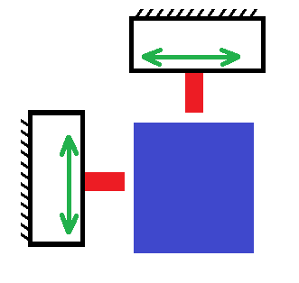 Bir birine dik duran iki mekanizma saseye sabitlenmis durumda. Kirmizi kollar ok yonunde hareket edebiliyorlar.