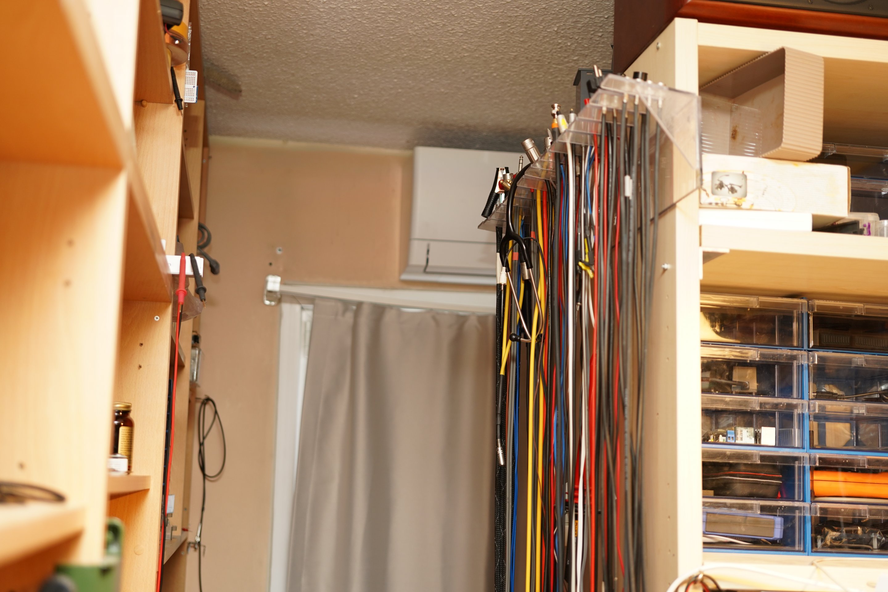 Aslinda yerim olmadigi ve askiya elbise asmayip bos durdugu icin askiyi kullaniyorum. Sanat okulunda duvara asili civili tahta kullaniyorduk. Boyle bir duzenek sartti cunku bazi deneylerde plancete uzerinde nerden bakarsan bak adam basi 20 kablo kullanmak gerekiyordu. Sinifta 20 plancete oldugunu varsayarasak 400 tane kablo.