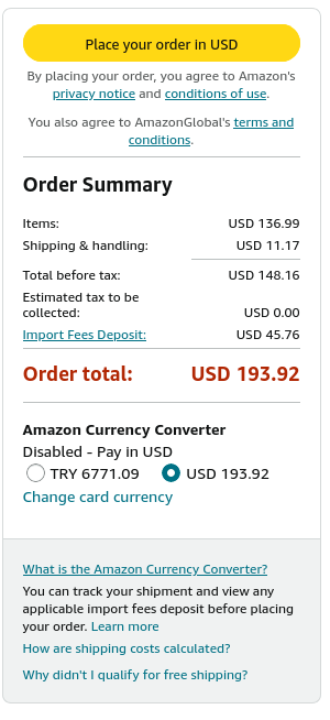Bu durumda ödeme sayfasında gümrük bedeli de yansıyor. Ayrıca yukarıdaki gümrük uyarısı da yok.