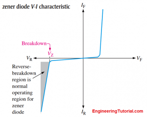 • Zener üzerindeki gerilim üzerinden geçen akıma göre belli bir aralıkta olsa da değişir. Akım arttıkça kırılma gerilimi de artar. Aşağıdaki şemada "breakdown" yazan bölgede ve taralı alanda bu drumu görebilirsiniz.